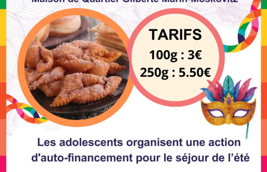 Le Centre Culturel et Social des Barres et du Mont et la Maison de Quartier Gilberte Marin-Moskovitz 🏡 organisent une vente de beignets de carnaval 🎭🍩, dans le cadre d’une action d’auto-financement portée par les adolescents.