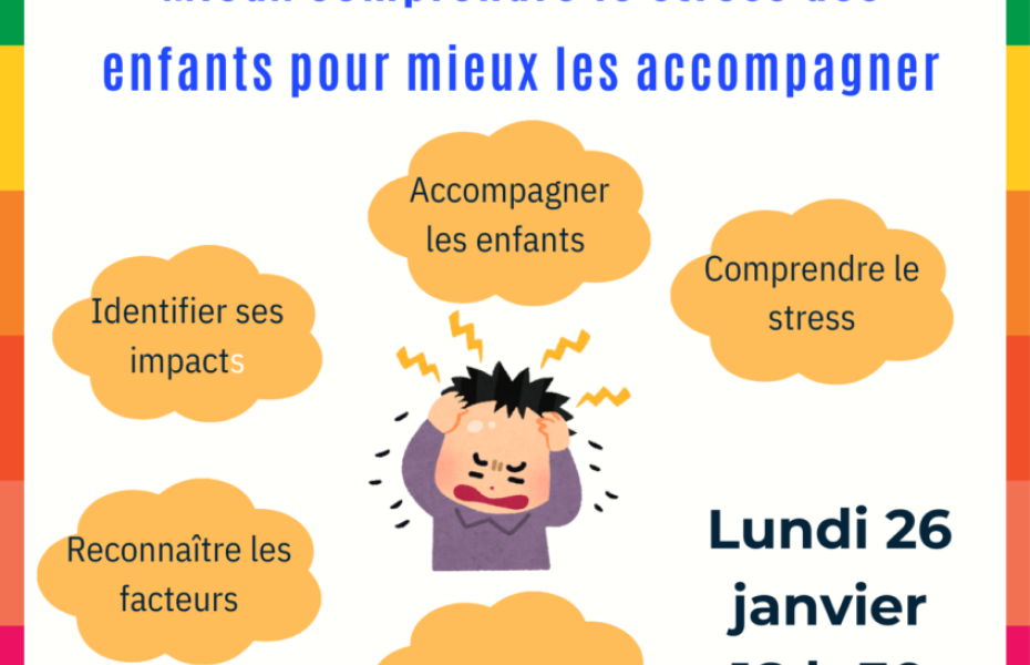 Cette rencontre a pour objectif d’aider les adultes à mieux identifier le stress chez l’enfant, à en comprendre les causes et les impacts, et à découvrir des pistes pour favoriser son apaisement. À travers des apports théoriques et des exemples concrets, la conférence abordera notamment :