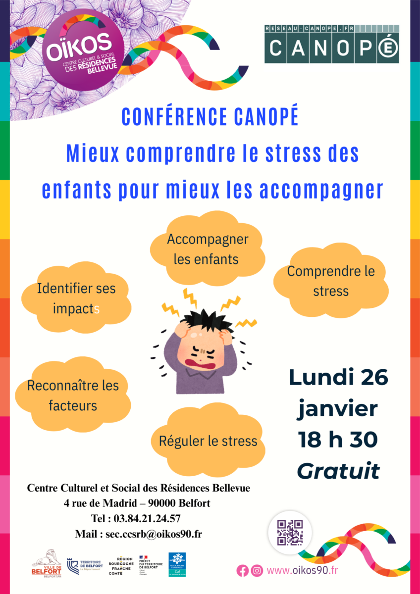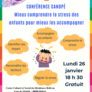 Le Centre Culturel et Social des Résidences Bellevue – OIKOS, en partenariat avec le réseau Canopé, propose une conférence dédiée à la compréhension du stress chez les enfants et aux moyens concrets de les accompagner au quotidien.
