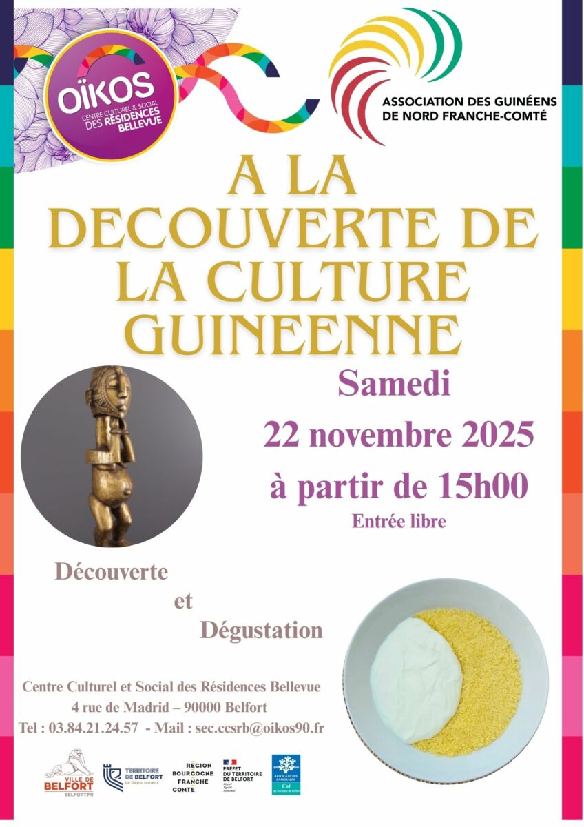 Le Centre Culturel et Social des Résidences Bellevue, en partenariat avec l’Association des Guinéens de Nord Franche-Comté, vous invite à une immersion dans la culture guinéenne le samedi 22 novembre 2025 à partir de 15h00 🕒.