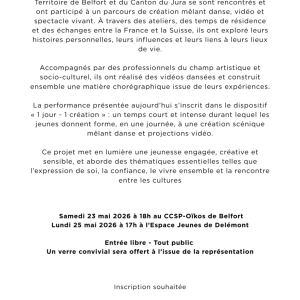 Ce projet réunit deux groupes de jeunes âgés de 13 à 16 ans, originaires de Delémont et de Belfort, autour d’un parcours de création mêlant vidéo, danse et spectacle vivant. Tout au long de l’année scolaire 2025-2026, ils participent à des ateliers réguliers et à des temps de résidence artistique, encadrés par des professionnels de la compagnie AdVance et des animateurs socioculturels.