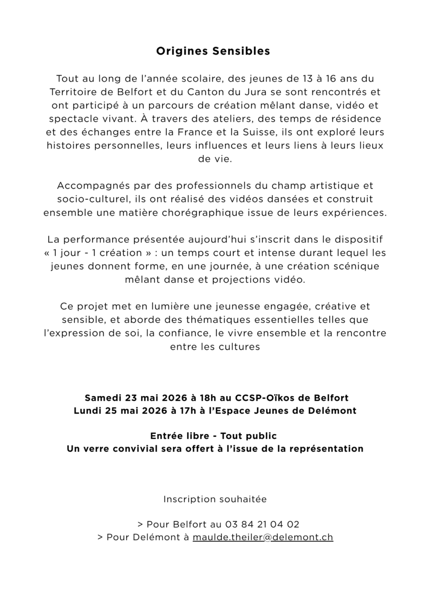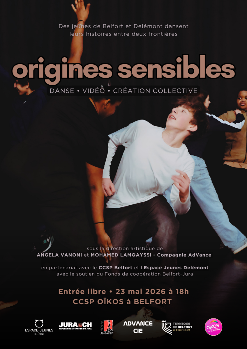 Le projet Origines Sensibles est une initiative artistique et culturelle transfrontalière portée par la compagnie AdVance, en partenariat avec l’Espace-Jeunes de Delémont et le Centre Culturel et Social de la Pépinière à Belfort. Il s’inscrit dans une dynamique de coopération entre le canton du Jura (Suisse) et le Territoire de Belfort (France), soutenue par le Fonds BELJU.