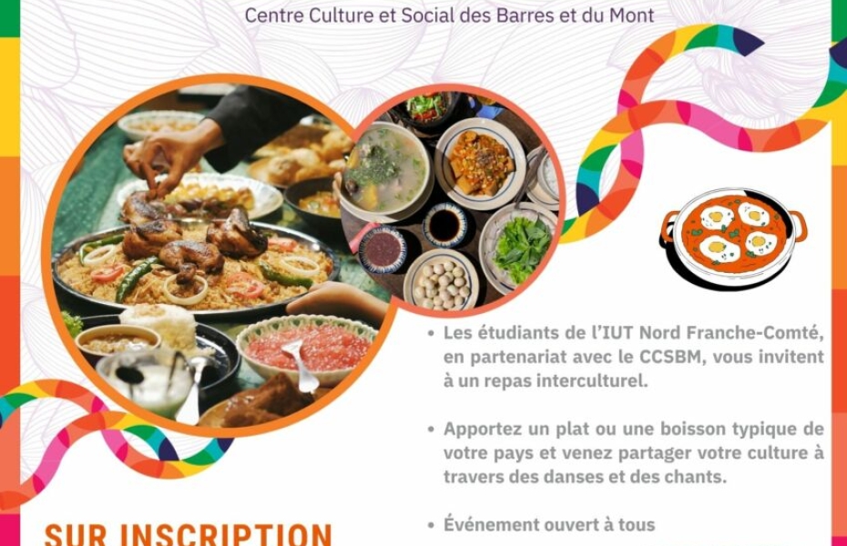 Les étudiants de l’IUT Nord Franche-Comté, en partenariat avec le Centre Culturel et Social des Barres et du Mont (CCSBM), vous invitent à un repas interculturel convivial et festif.