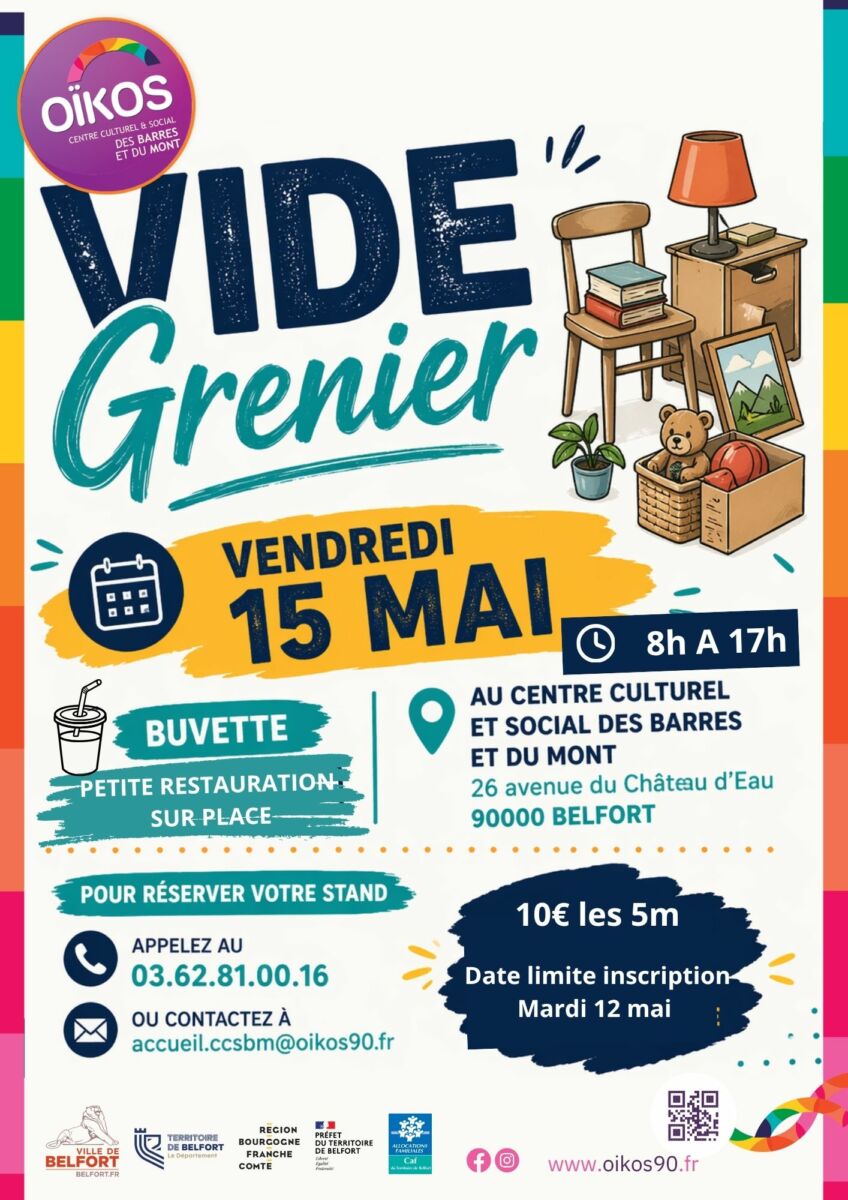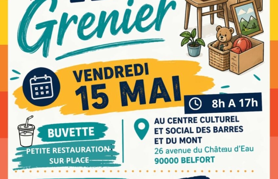 Le Centre Culturel et Social des Barres et du Mont organise un vide-grenier ouvert à tous 🛍️, le vendredi 15 mai à Belfort 📍.